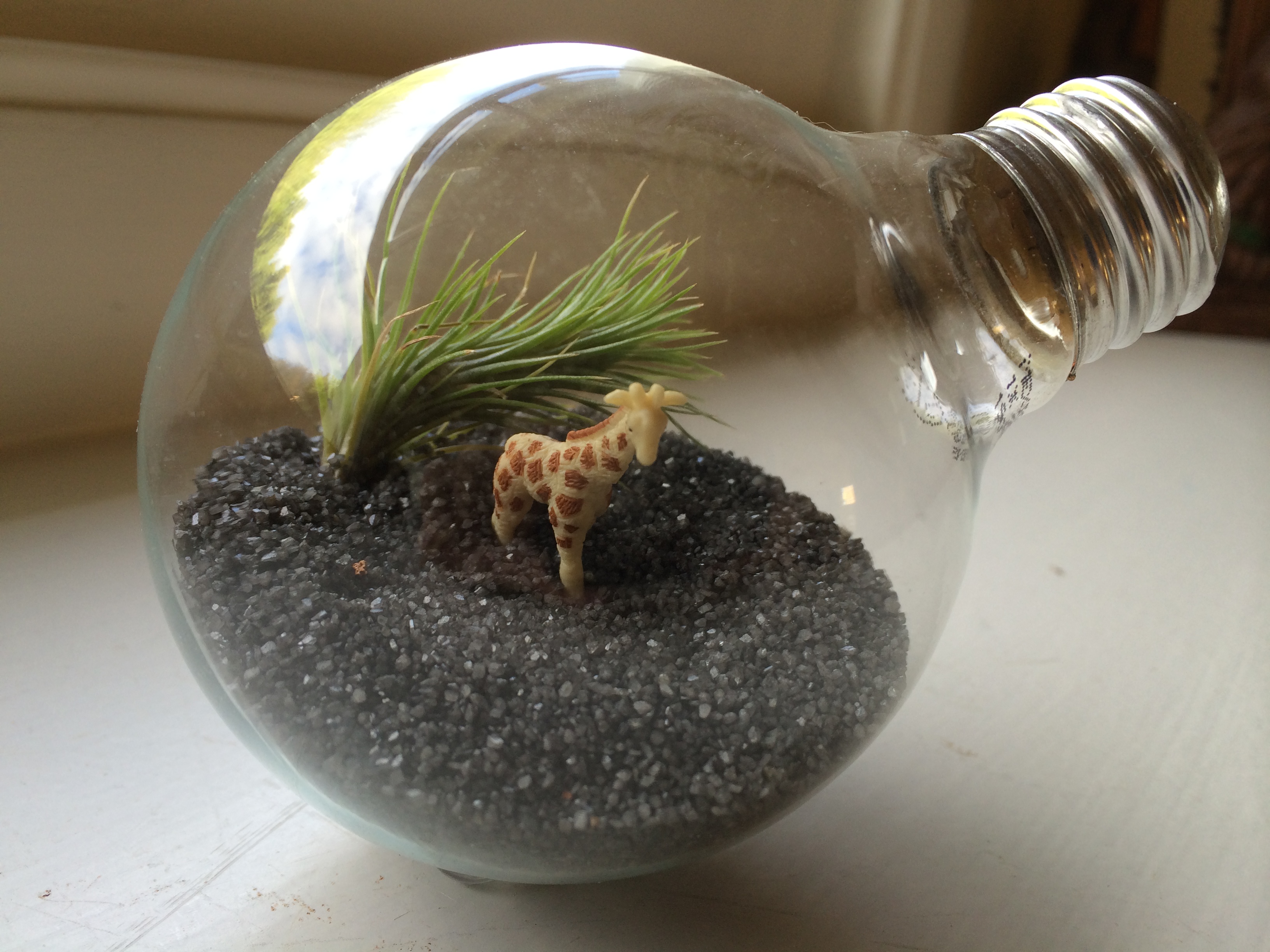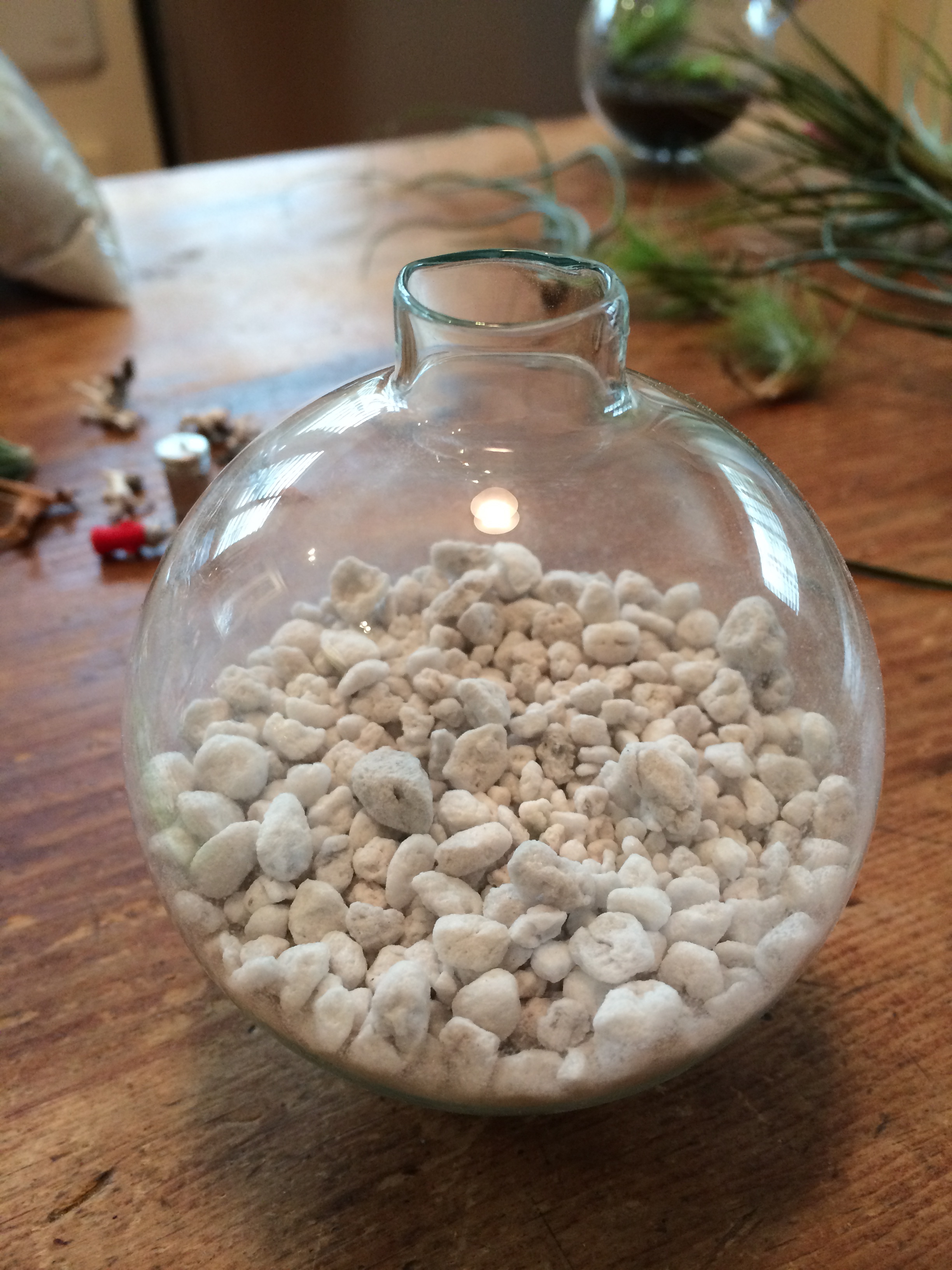 I stumbled on light bulb terrariums on one of my internet searches and I decided to make some. As it turns out it takes a bit more work to remove the innards of a light bulb than I wanted to do, and after removing the innards the entrance hole is still quite small. I found a nice alternative — glass ornaments.